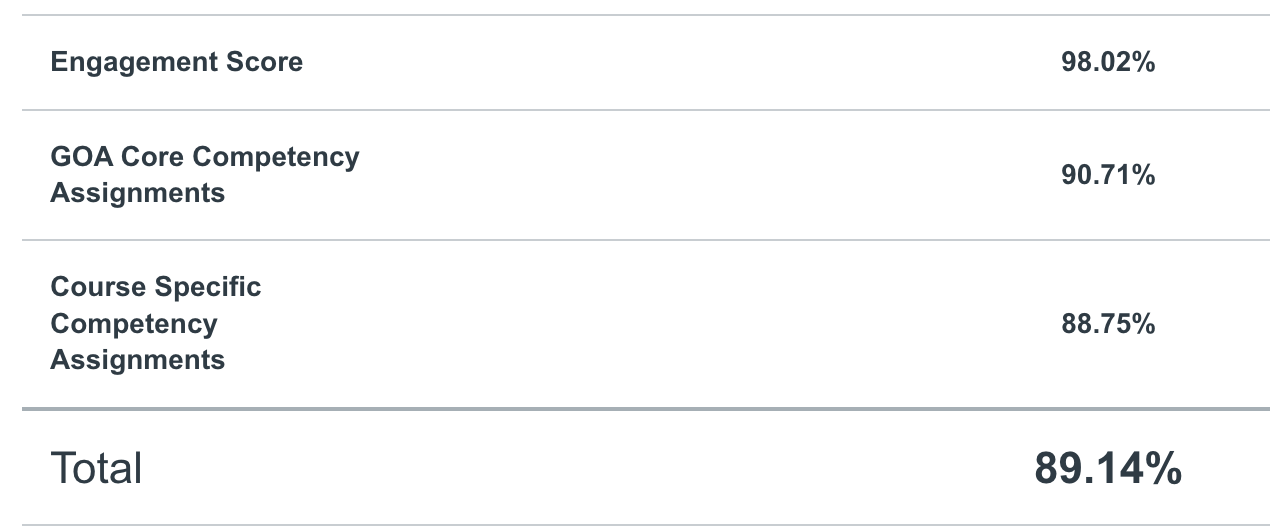 We are committed to having the grades that students earn in our classes be reflective of their level of mastery of the competencies around which the course is centered as long as they are committed, engaged members of the online community - and we measure that with our Engagement Score metric. Students can always see their competency grades and their Engagement Score in the LMS, and they know that if their Engagement Score drops below 70%, their GOA teacher will not have sufficient evidence of their learning to assign a passing grade. We actually have an automation that overrides a student’s course grade in the LMS with “Not Passing - Insufficient Evidence” if and when their Engagement Score drops below that threshold. 70% is a floor, a minimum, a mark of sufficiency without which we cannot make a professional judgment on what the student has really learned. It’s a lot like the common school policy that says that students who miss 30% of class meetings don’t pass the course. Students keep their Engagement Scores high by turning in the work, doing so punctually, participating fully in online discussions, showing up to Zoom meetings and communicating proactively with their teachers and peers. In previous years, we used an approach that we called Assignment Completion Rate (ACR), which was just that: the percent of assignments the student completed. Based on feedback from faculty and school Site Directors, however, for 2024-2025 we have moved to this more evolved, more nuanced metric for understanding whether a GOA student is an active member of the community who is truly thriving in our globally networked courses.
