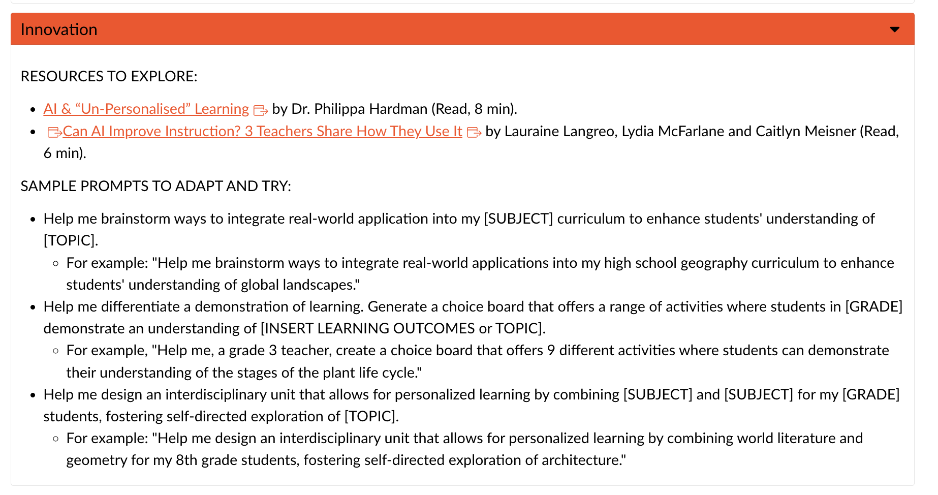 In this module from one of our online courses, teachers are challenged to connect a prompt for AI directly with something they are doing in their own classrooms. By testing new approaches with their students and reflecting on the outcomes, educators can engage in job-embedded learning that is immediately relevant and practical. In this way, we can ensure that professional development is not just theoretically interesting, but practically useful and immediately applicable.
