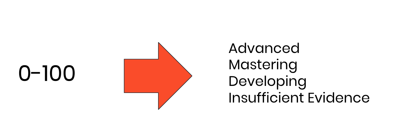 Teachers at GOA choose between four proficiency levels (not 100) when they look at a piece of work and consider the evidence they see of learning in that work. For each of the outcomes targeted on a particular assignment, the work is either Advanced, Mastering, Developing, or Insufficient Evidence. As Guskey and others have rightly pointed out, few teachers can look at many students' work and accurately and consistently distinguish between work that deserves an 88 and work that deserves an 89. The more interstices there are between the grading designations a school uses, the more open doors it creates for error and implicit bias to permeate its classes. When you have a team of 100+ teachers as diverse as GOA's, the potential for inconsistency and actual harm is even greater (see Feldman Chapter 7 for a larger discussion on this).