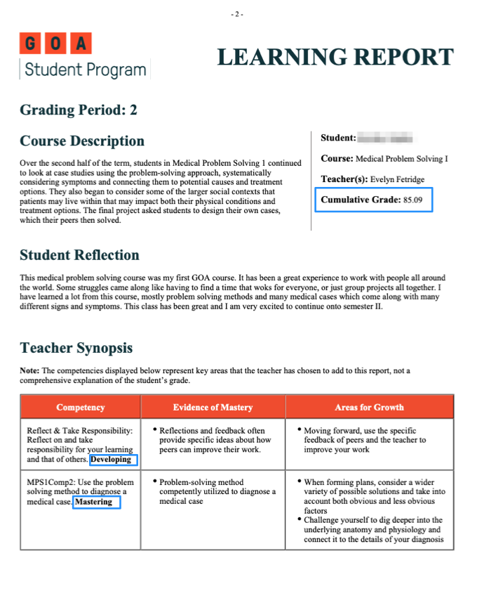 At GOA, we believe that students grow and learn when they have clarity about the goals they are trying to achieve, when they receive actionable feedback aligned to those goals, and when they have multiple opportunities to apply that feedback, to improve their skills, and ultimately to transfer their newfound skills and understandings to different contexts. This is why we have embraced competency-based learning as a framework for our student program courses and have spent the last five years honing that approach. Nevertheless, our students, teachers, and member schools occupy a particular place in the wider world, and as a result, GOA is faced with a conundrum: we are committed to competency-based learning, yet must deliver reports to a diverse membership that requires grades to be reported as a percentage (0-100).