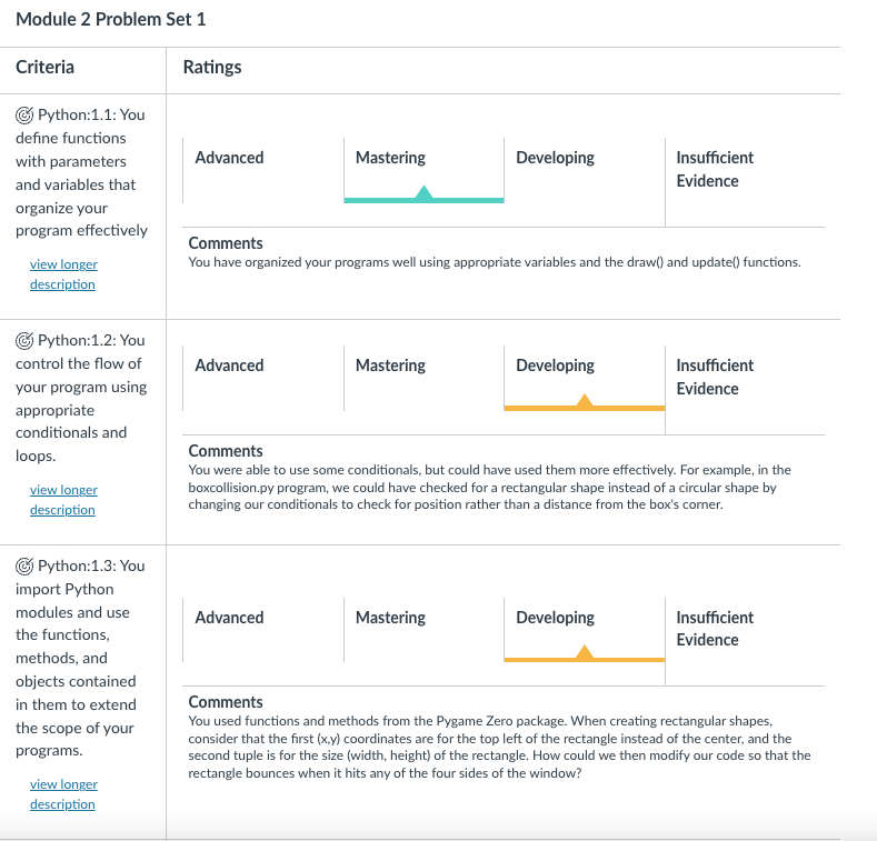 With the transfer of skills as an important goal, we focus on assessing outcomes and competencies over time rather than assigning grades to assignments as singular events. Where there is seldom an outside audience for assignment-level grades, teachers and schools can move away from them relatively easily while strengthening their approach to feedback. Norford and Marzano refer to this as the principle of unidimensionality. If an assessment seeks to measure two or more outcomes, we assess each of those outcomes separately through a rubric coupled with actionable feedback. Putting an 88 or a B+ at the top of the assignment, in addition, is superfluous and only serves to muddle the feedback. Two students who earned an 88 likely had very different and jagged performances on that assessment. It causes students to turn to one another when work is handed back and ask, "What did you get?" rather than "How well did you use conditions and loops in your programming?", which, in the example rubric below, is clearly the conversation that the teacher wants the students to be having.