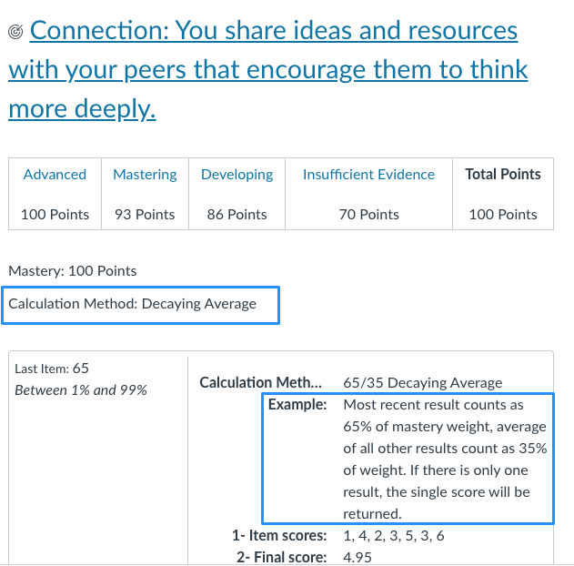 Thus, a student has earned a series of proficiency ratings associated with a learning outcome, and GOA assigns numeric values to those assessments - what then? One option would be to default to the traditional practice of averaging those numbers and slapping them on a report card. That said, researchers like Joe Feldman and others make clear that grades based on pure averages can be inequitable in that they result in two students who have ultimately attained the same skills and understandings walking away from the course with very different grades (actually, hat tip to Peter Gow who was preaching this gospel in new teacher orientation at BCDSchool many years ago!). Some schools in standards-based or mastery-based environments base grades on the most recent demonstration of learning. At GOA, we use decaying averages so that a student's grade on a particular learning outcome weighs the most recent assessment more heavily than all of the previous attempts. The result is that competency grades at GOA grow and improve as the students grow and improve (without turning the final assessment into a high-stakes exam). In the end, the grades that schools report should be prepared with the freshest ingredients available (students' skills at a moment in time) rather than serving something up using the failed midterm exam that has been wilting in the back of more traditional gradebooks.