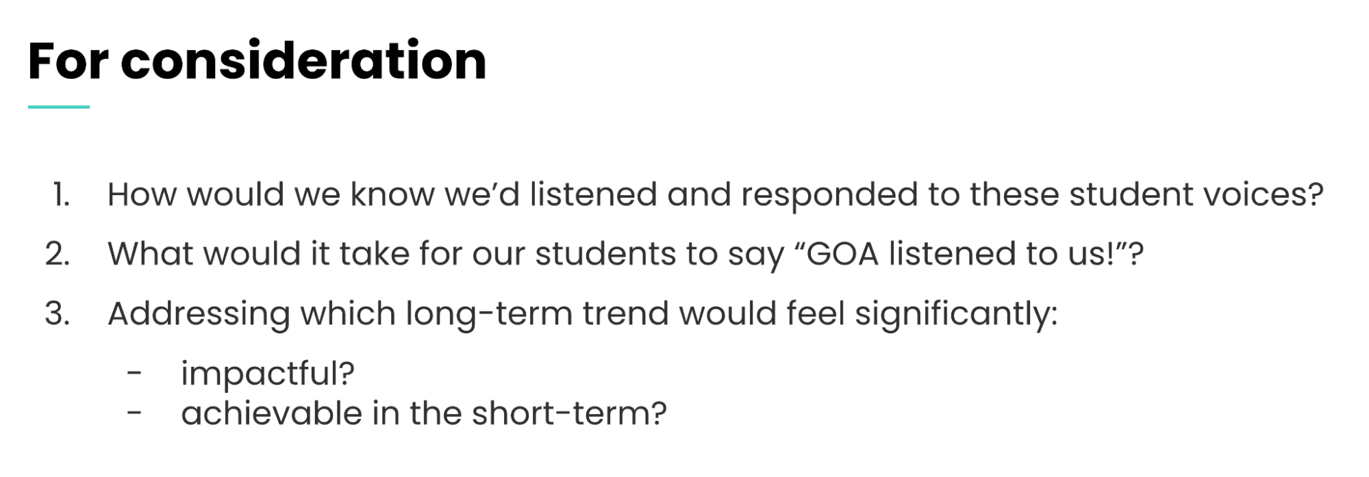 Later, when examining student survey results, the framing shifted again. Instead of asking, “What should we fix?” the group was invited to consider: How would we know we had truly listened and responded to these student voices? What would it take for students to say, ‘GOA listened to us’? The questions pushed beyond surface-level responsiveness toward visibility, feasibility, and impact. Which trends would be meaningful to address? Which were achievable in the short term? And how might action be experienced from a student’s perspective, not just measured internally