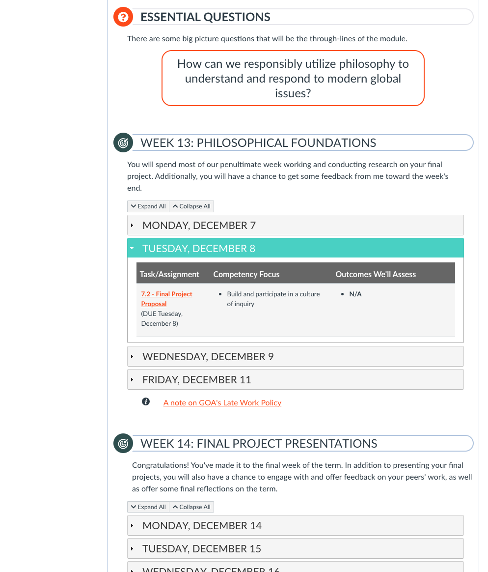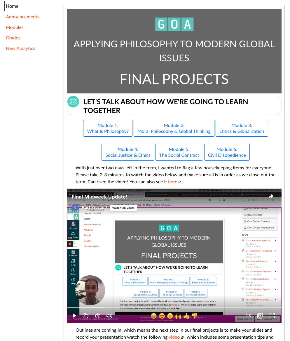 The weekly module structure in this course is standardized – always with an introduction to the topic, exploration of content, opportunities to connect with others and apply their learning, with a closing check-in activity with their instructor.