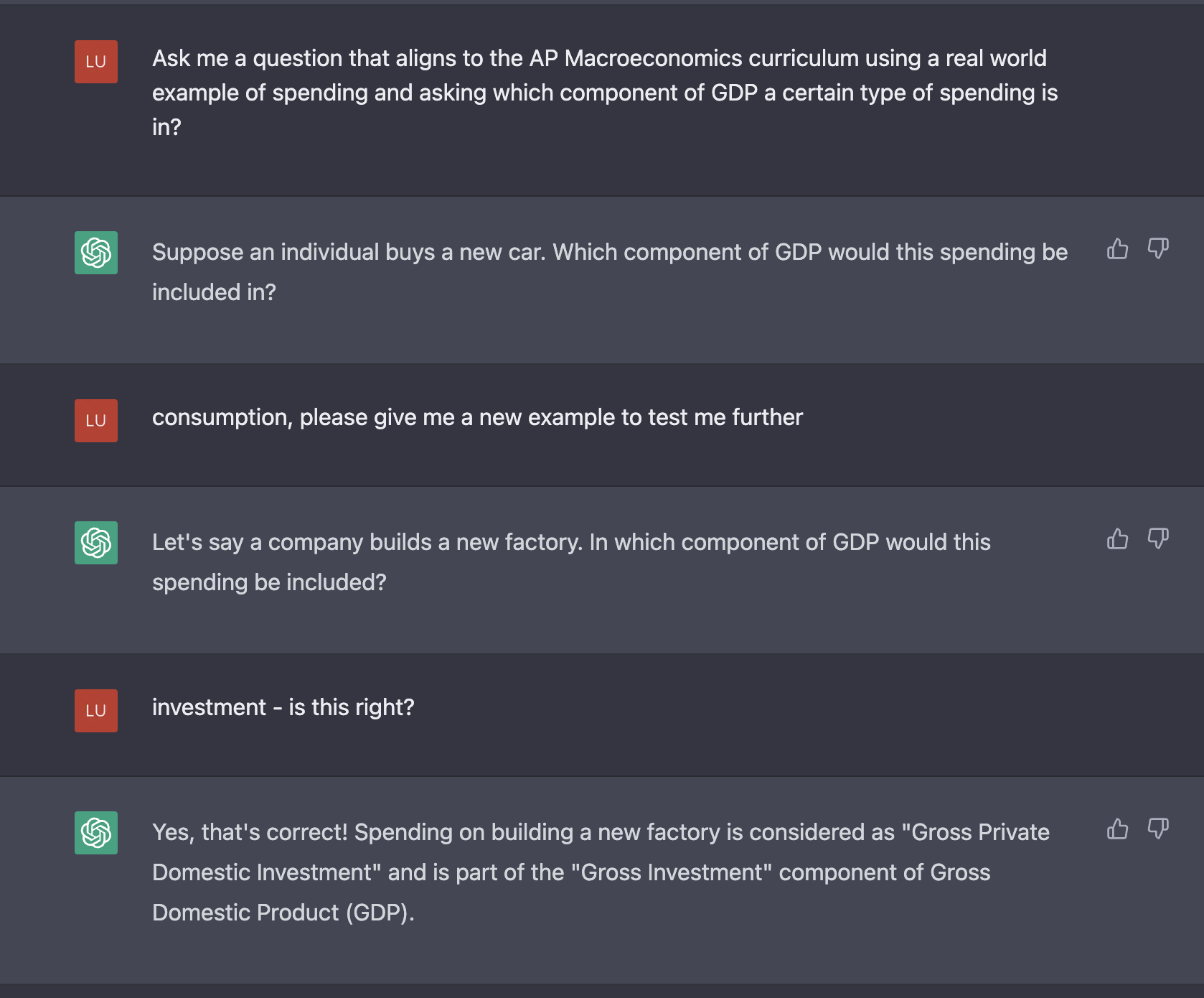 For example, my colleague Lucas Ames recently acted as a student in Advanced Placement Macroeconomics and used ChatGPT as a study tool to self-assess, knowing that AI can generate an infinite amount of questions that can escalate in difficulty if we ask it to. We should spend time showing students how artificial intelligence can make self-study easier, more accessible, and more personalized. Teachers could use this same strategy to create differentiated lesson plans or formative assessments that are more responsive to what their students need.