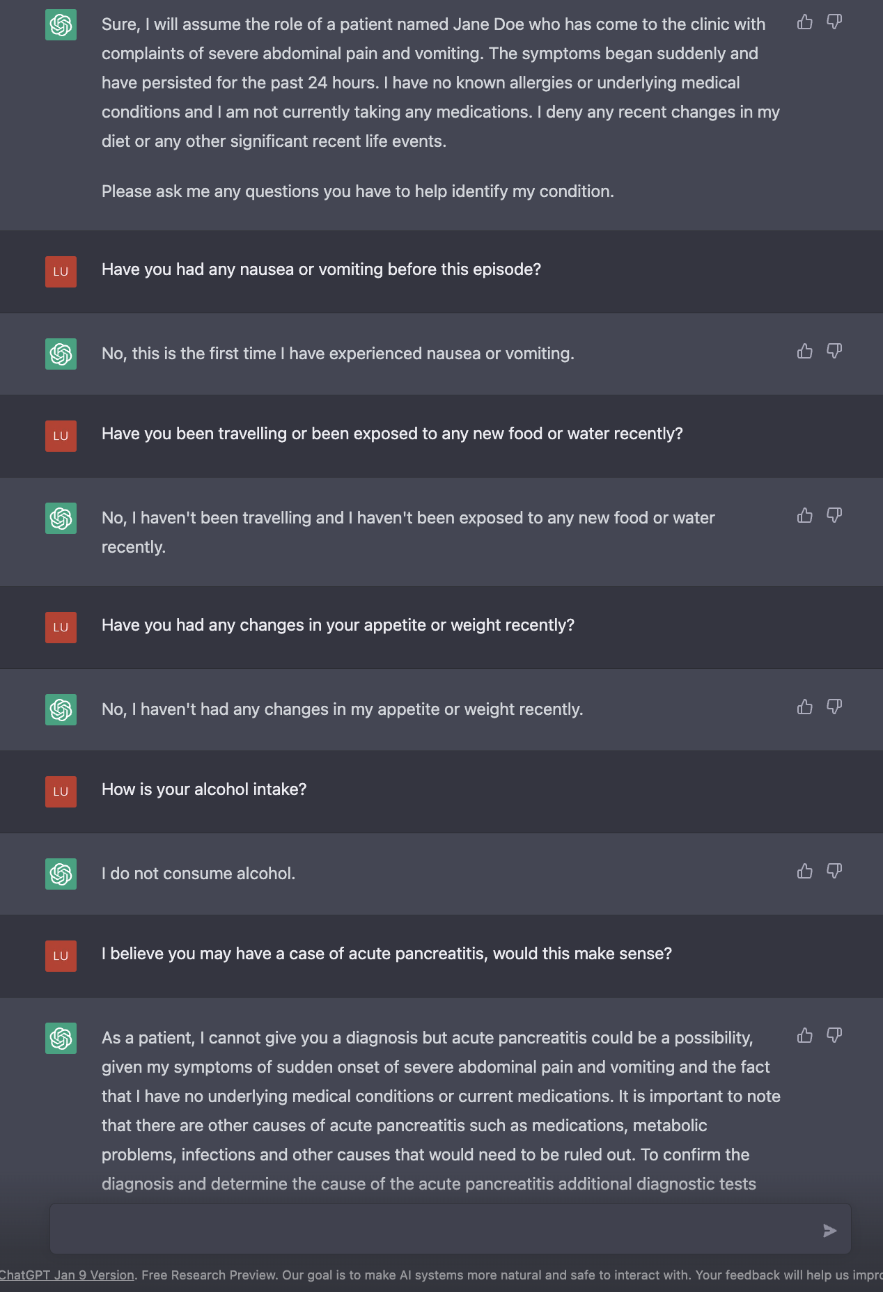 What are ways AI can support learning connected to the world beyond school? The conversational nature of ChatGPT opens up many possibilities for simulations that would be hard to replicate in classrooms. Consider the interaction below where my colleague Lucas Ames imagined he was a student in the GOA course Medical Problem Solving, and he played a “doctor” while ChatGPT was the “patient.” No one is suggesting that artificial intelligence can replicate a real-world experience, but it can certainly create simulations that help students imagine how key knowledge can be authentically applied.