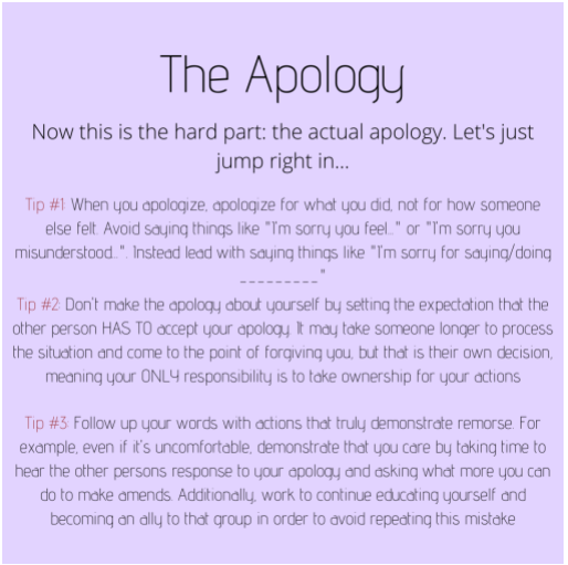 Embedded in the assignment is a guide on how to apologize after a microaggression, poor decision, or misstep around race. Students are directed to listen to the podcast Still Processing on Apology, which asks, “How can we grow into the people we want to become when we can’t acknowledge our mistakes and the effect that they've had on others?”