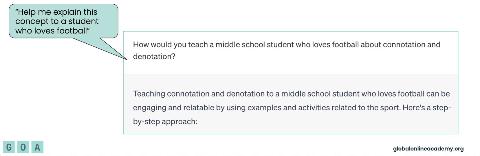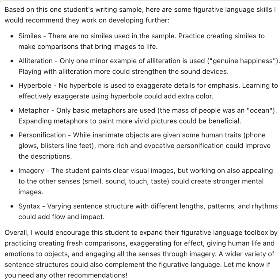AI, when used thoughtfully, can assist in personalizing these supports, helping to tailor supports for each learner’s needs. Consider, for example, the responses shared by Anthropic’s Claude when a student work sample is shared along with the prompt, “What specific skills should this student work on developing in our figurative language unit?”
