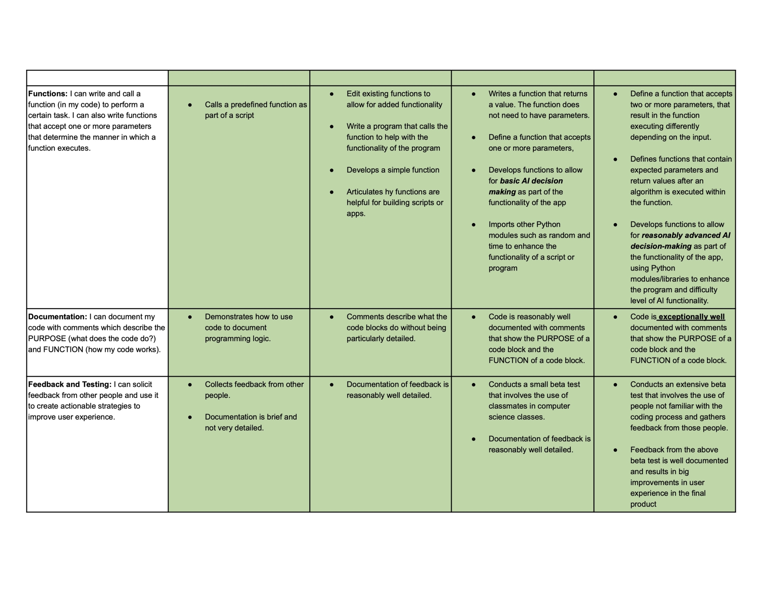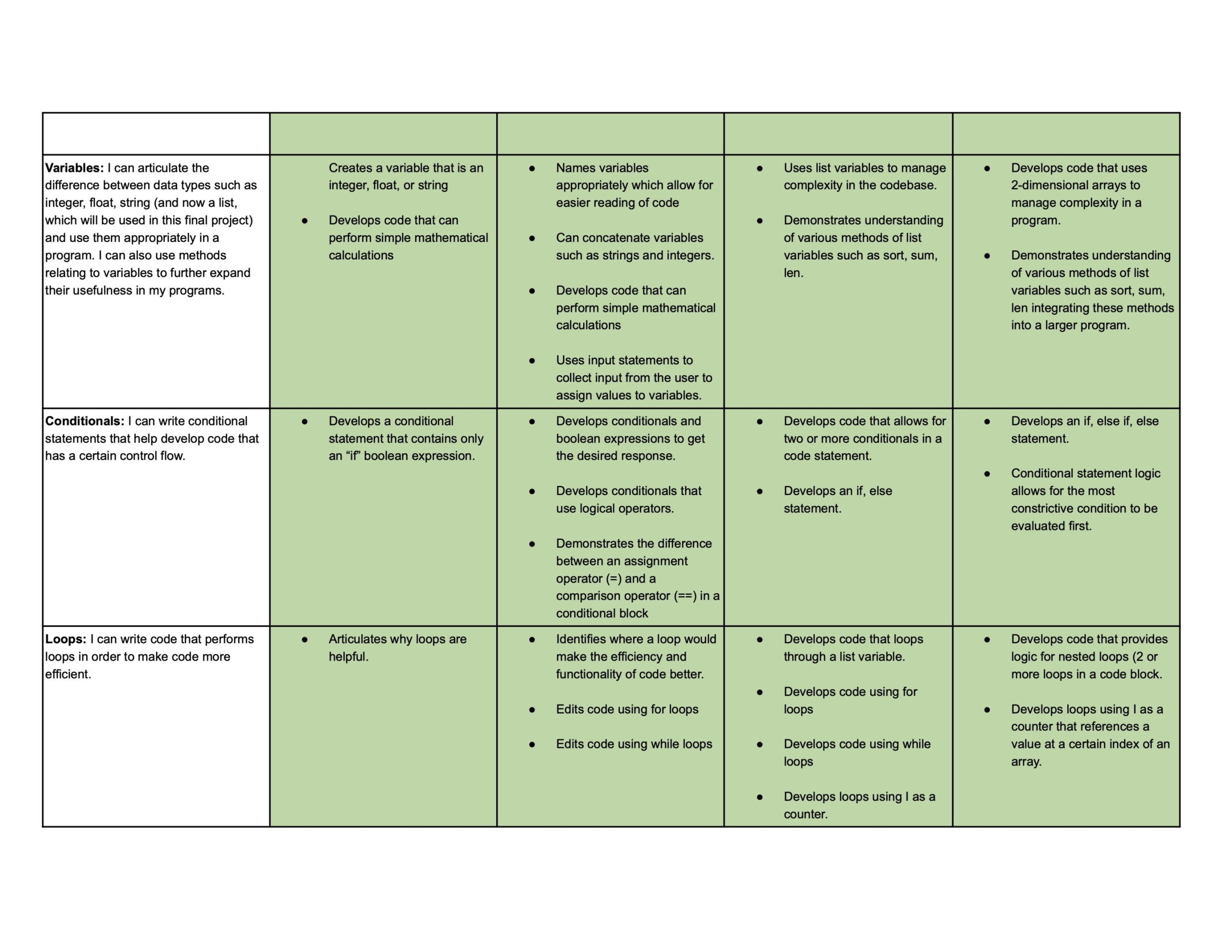 It was such a helpful exercise for me personally to really dig into what a computer science student earning an A could do upon leaving my class. This process also allowed me to construct learning experiences that allowed the competency levels that I had identified to improve.