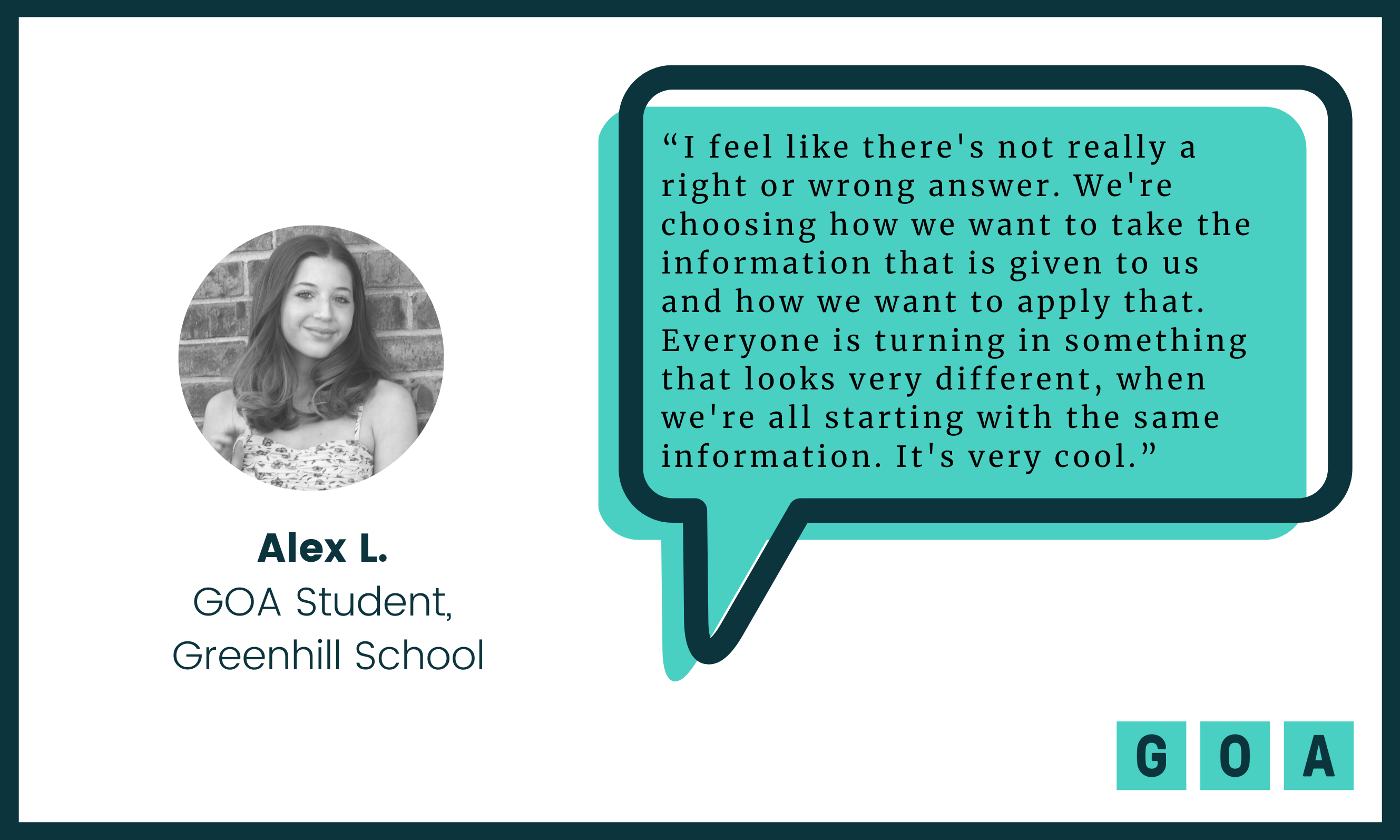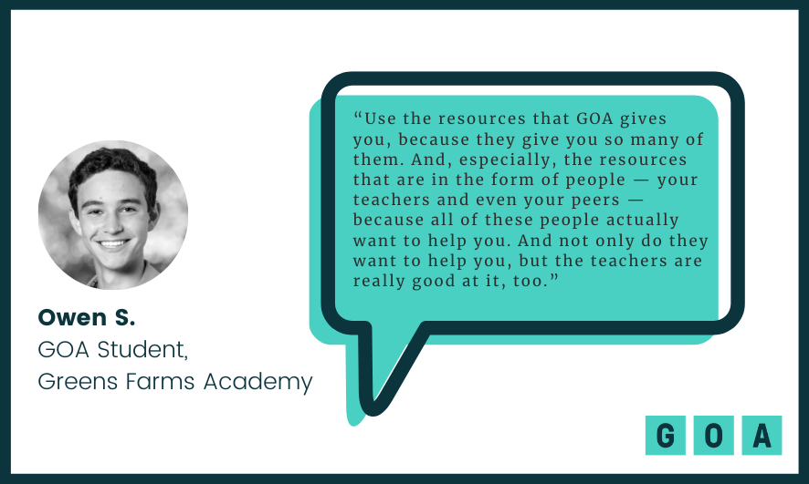 This is the area Owen focuses on most when asked about what advice he’d give to a student signed up for a GOA course. “Use the resources that GOA gives you, because they give you so many of them. And, especially, the resources that are in the form of people — your teachers and even your peers — because all of these people actually want to help you. And not only do they want to help you, but the teachers are really good at it, too,” he advised. “So ask for the help, take the support. Even if it’s an asynchronous course like mine was, try to open up a little bit and ask for that help if you are ever struggling.”