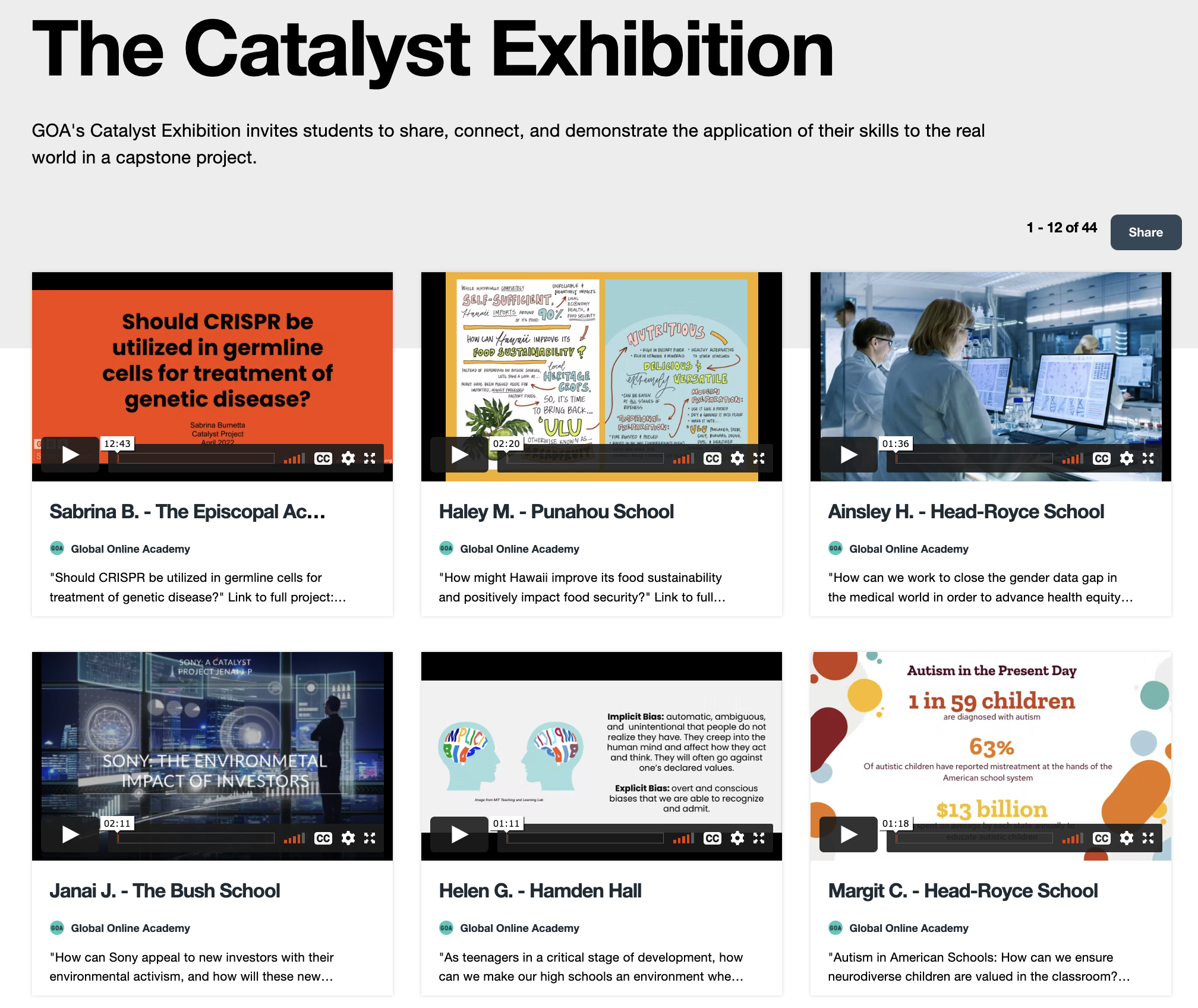 At GOA, we support students to pursue their interests and express their talents by designing their own culminating projects and celebrating what they learned to a global audience through The Catalyst Exhibition. This summer over 100 projects were submitted and explored by teachers, students, and community members. Courses that participated in Catalyst this summer included Abnormal Psychology, Introduction to Psychology, How to Argue Well, Cybersecurity, and Digital Photography.