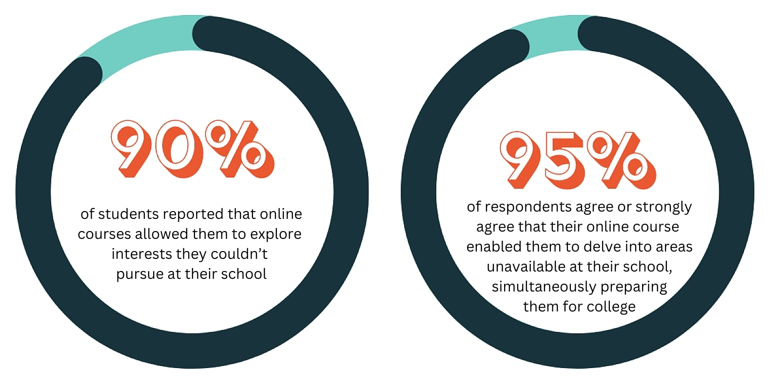 Interest Exploration: Over 90% of students reported that online courses allowed them to explore interests they couldn't pursue at their school.