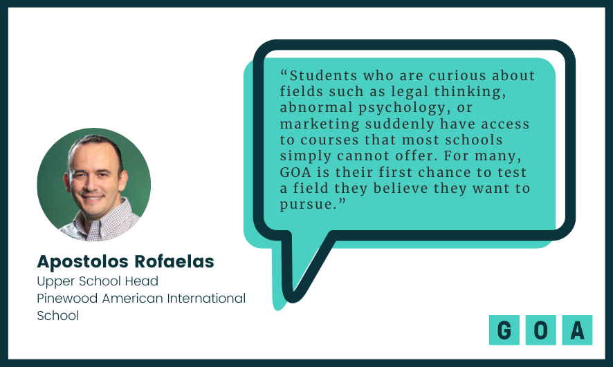 The Impact: “Students who are curious about fields such as legal thinking, abnormal psychology, or marketing suddenly have access to courses that most schools simply cannot offer,” says Apostolos Rofaelas, Upper School Head at Pinewood American International School. “For many, GOA is their first chance to test a field they believe they want to pursue.”