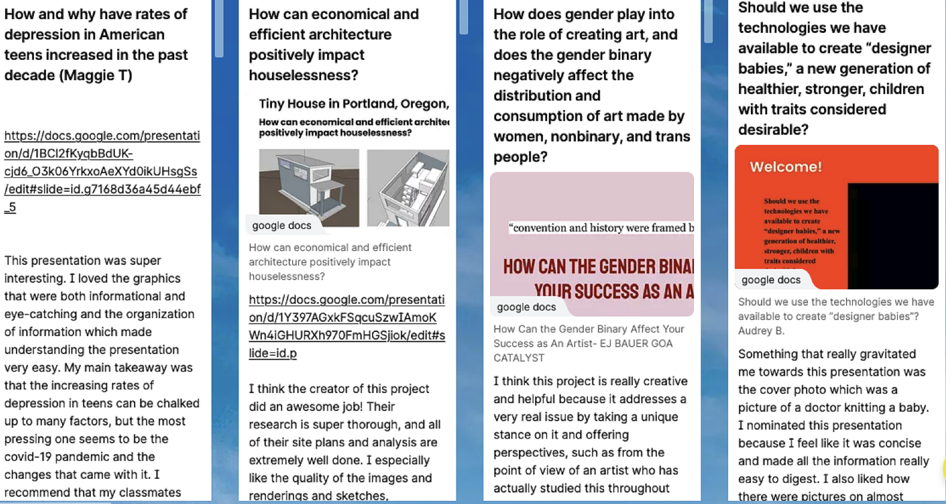 Additionally, if the promise of competency-based learning is to “mirror how people learn, work, and succeed [emphasis mine] in the world,” let’s design an approach to recognizing academic achievement that mimics how adults succeed in the real world. Beyond the walls of a school, the way in which most adults achieve recognition is by presenting their work before an authentic audience. Whether the deliverable is a proposal delivered before a local council, an article published in a local paper, or a design for a bridge, the work serves as a conduit between the creator and the audience, and it’s the work product that fundamentally becomes the conversation of praise (or disparagement).